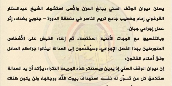 عاجل : ⚫️الوقف السني يعلن اعتقال المتورطين بقتل امام مسجد الدورة