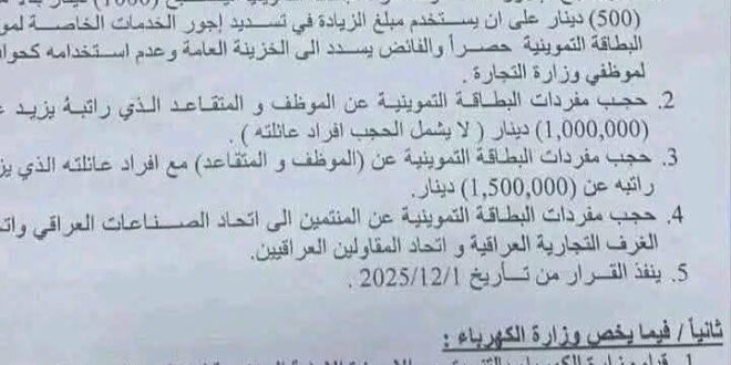 وثيقة .. وزارة التجارة تقرر حجب الحصة التموينية عن المتقاعد والموظف الذي يزيد راتبه عن مليون (ولا يشمل الحجب افراد عائلته).