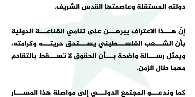 تحالف العزم يرحب بالاعتراف الدولي بدولة فلسطين ويدعو لمواصلة دعم حقوق الشعب الفلسطيني